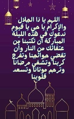 - اللهم يا ذا الجلال والإكرام، يا حي يا قيوم، ندعوك في هذه الليلة المباركة أن تكتبنا من عتقائك من النار، وأن تقضي حوائجنا، وتفرج كربنا، وتشفي مرضانا، وترحم موتانا، وتسعد قلوبنا.