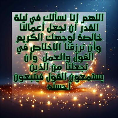- اللهم إنا نسألك في ليلة القدر أن تجعل أعمالنا خالصة لوجهك الكريم، وأن ترزقنا الإخلاص في القول والعمل، وأن تجعلنا من الذين يستمعون القول فيتبعون أحسنه.