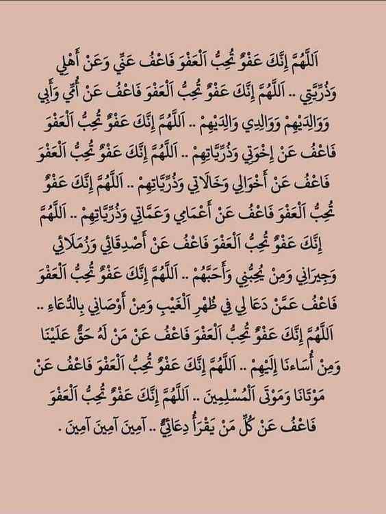 - اللهم إنك عفو كريم تحب العفو فاعفُ عنا، اللهم إنا نستغفرك لذنوبنا ونتوب إليك.