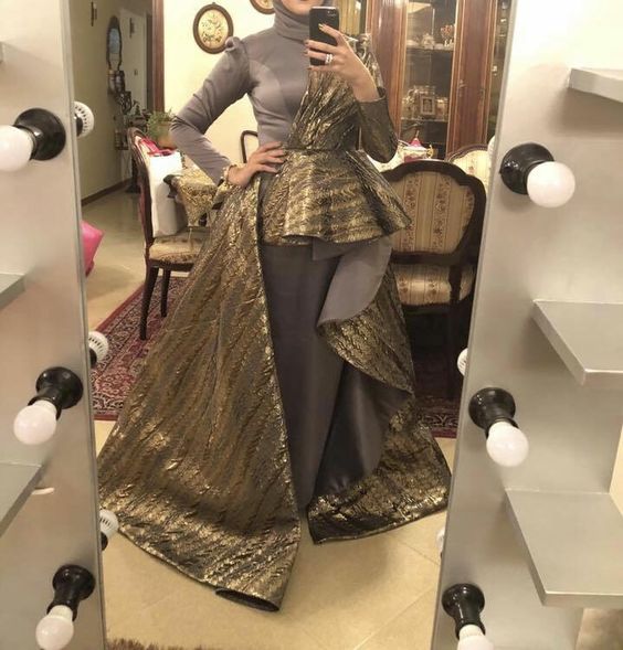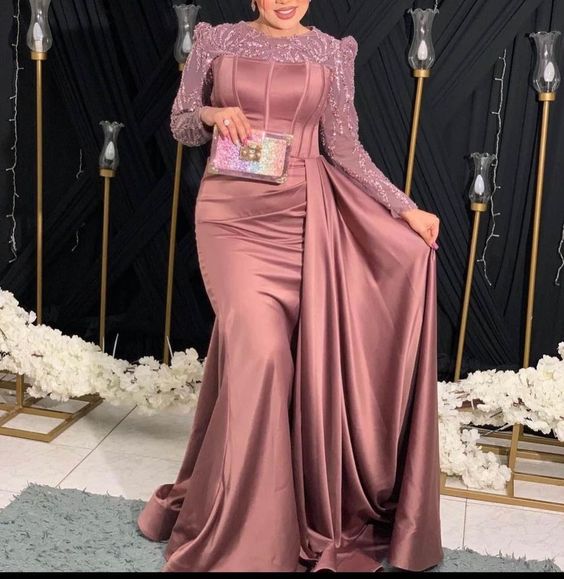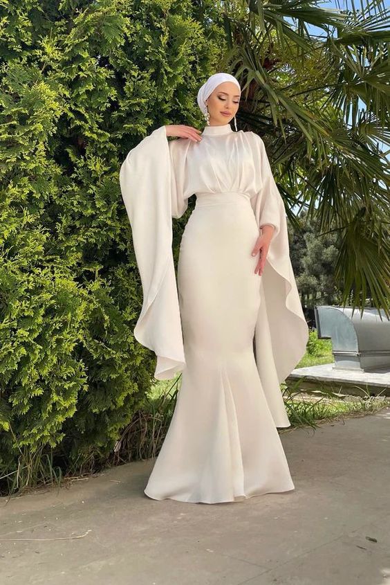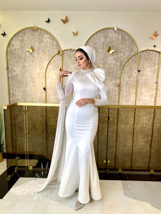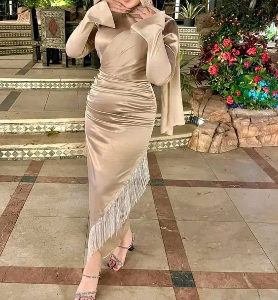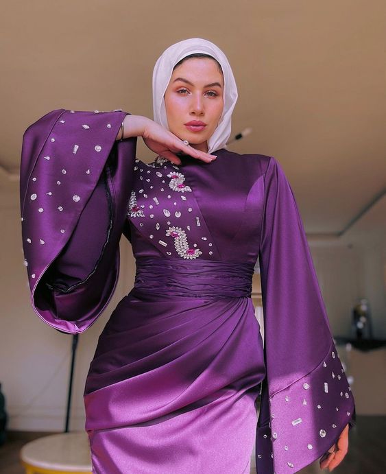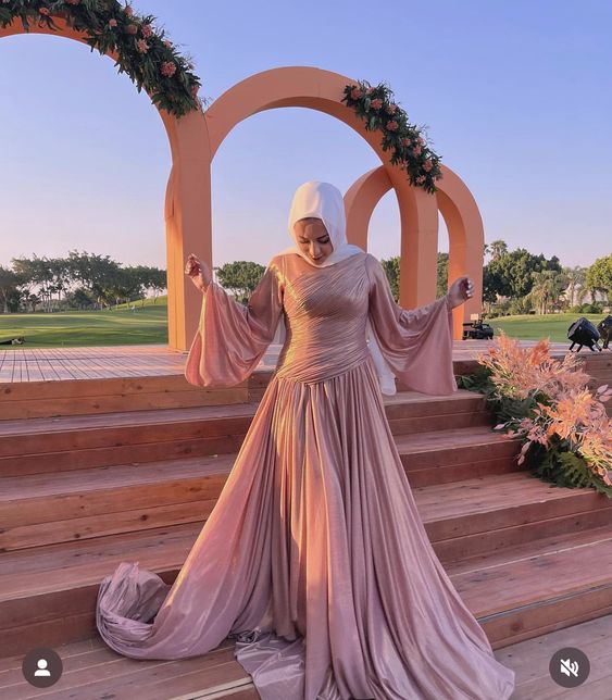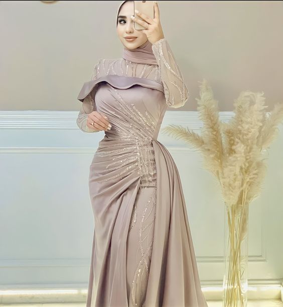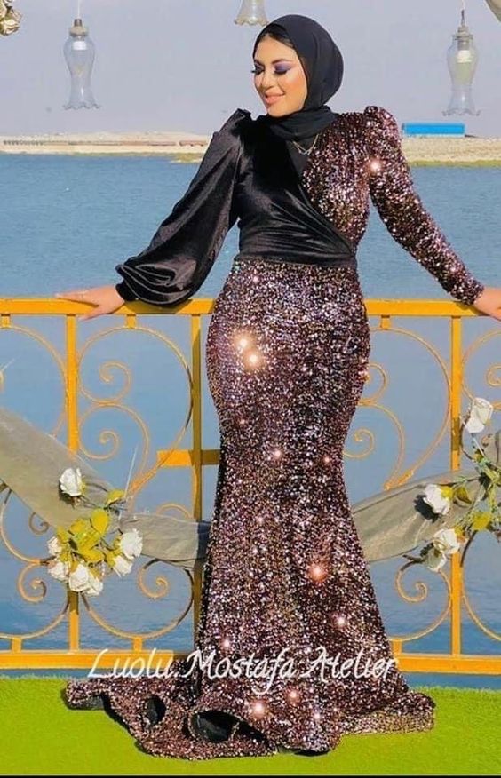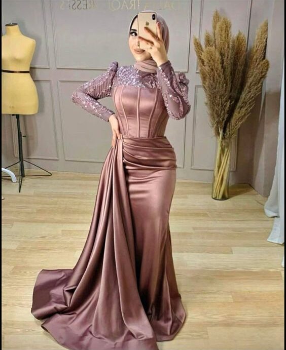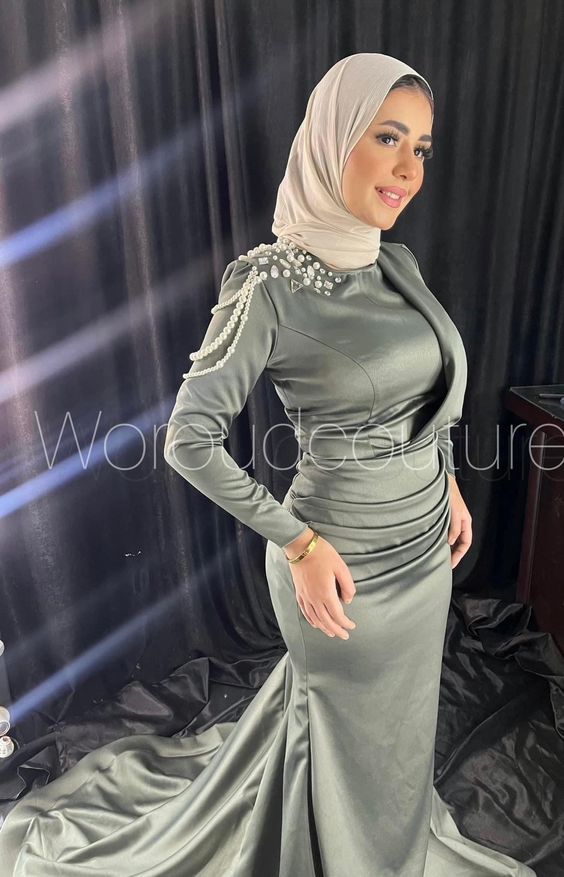 تألقي بفستان سواريه يشبه السمكة بأكمام طويلة وواسعة للمحجبات