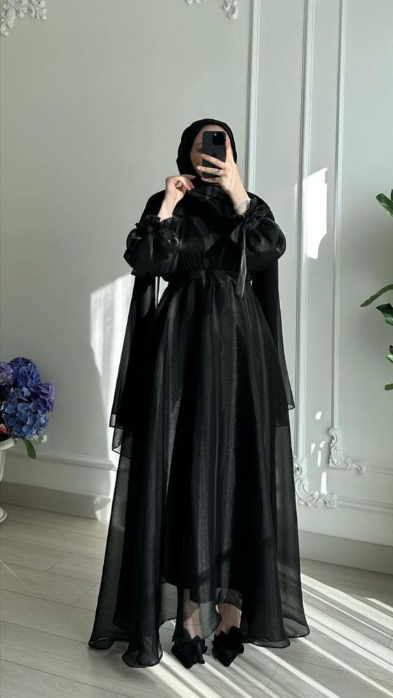 أروع فستان سواريه للمحجبات أسود من الأورجانزا التي عادت بقوة هذا العام