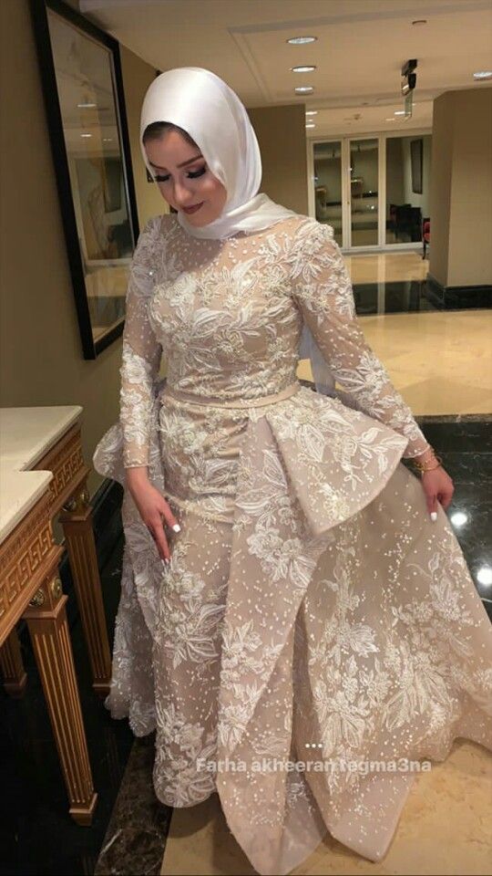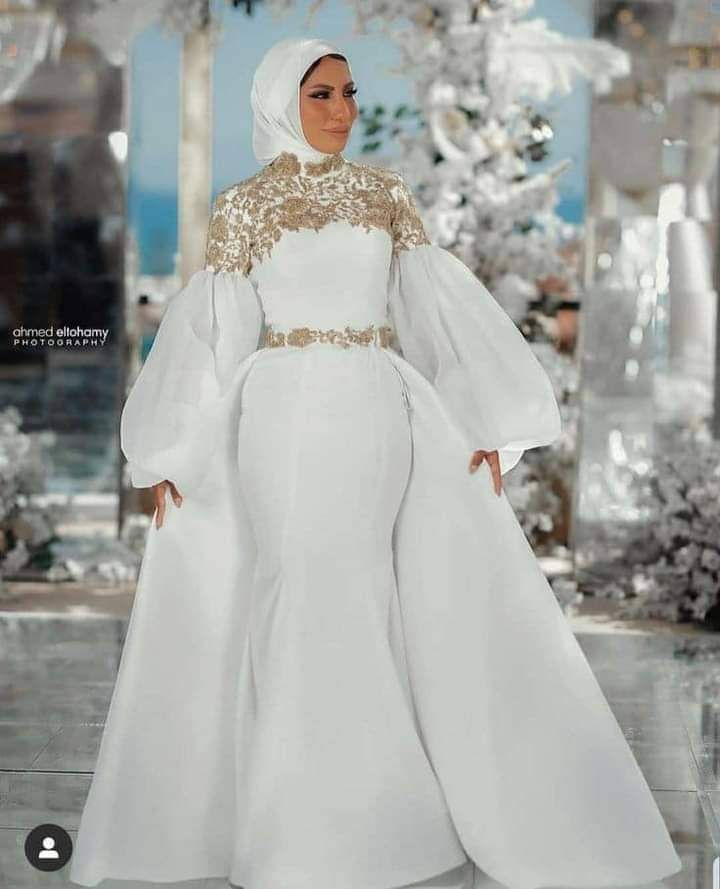 ما أجمل الأبيض المطعم بالدانيل الذهبي في فساتين المحجبات السواريه