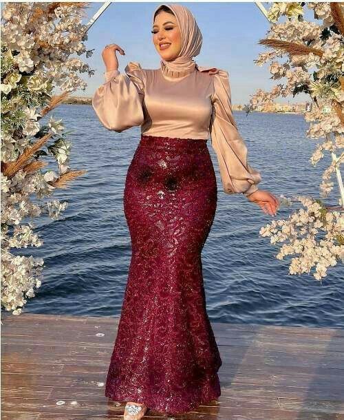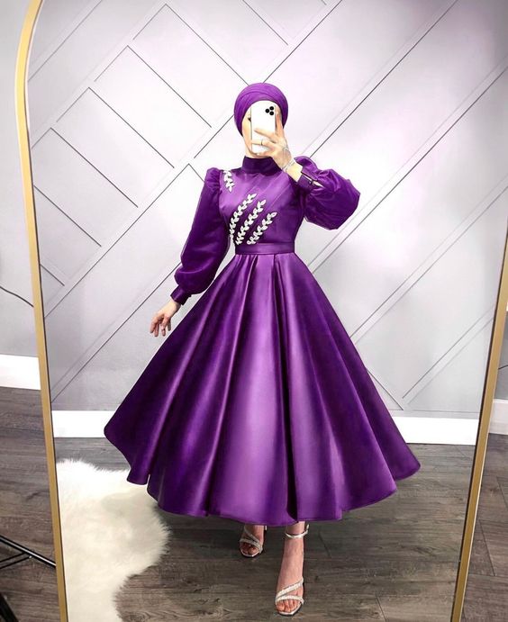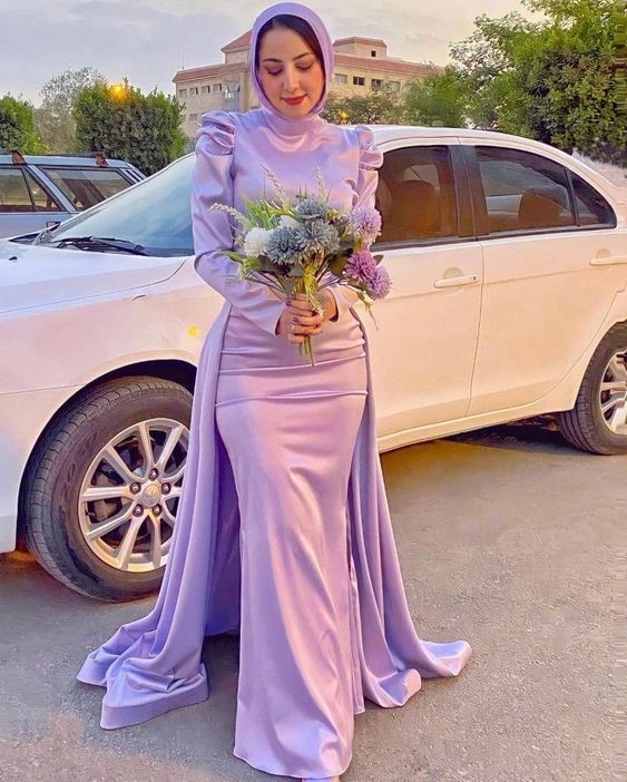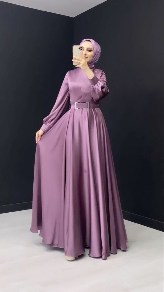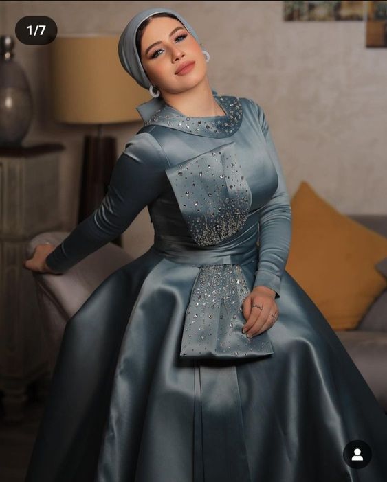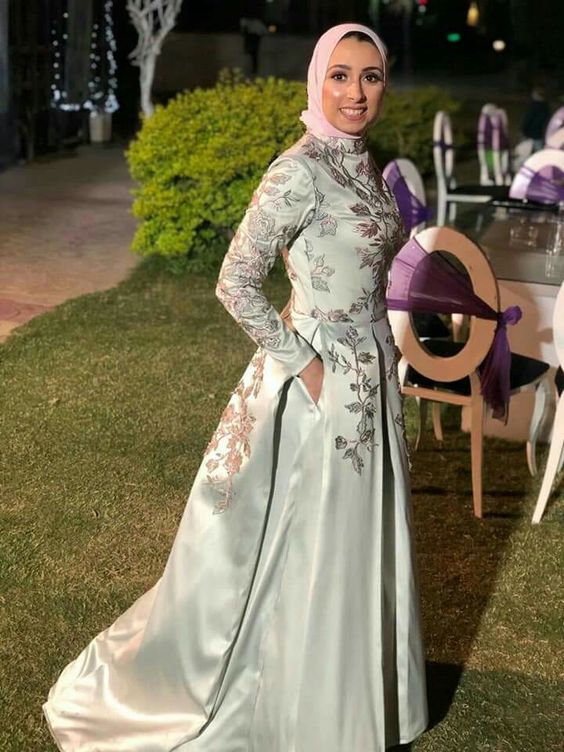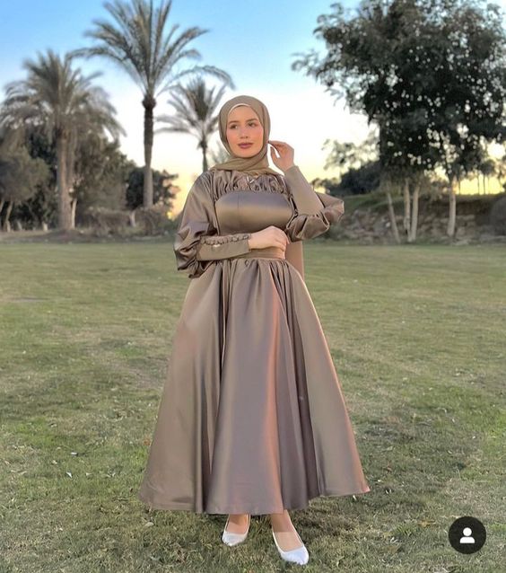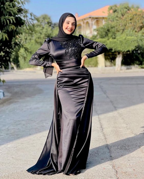 فستان من الستان المنقوش والسادة يظهر جمال المحجبة في المناسبات