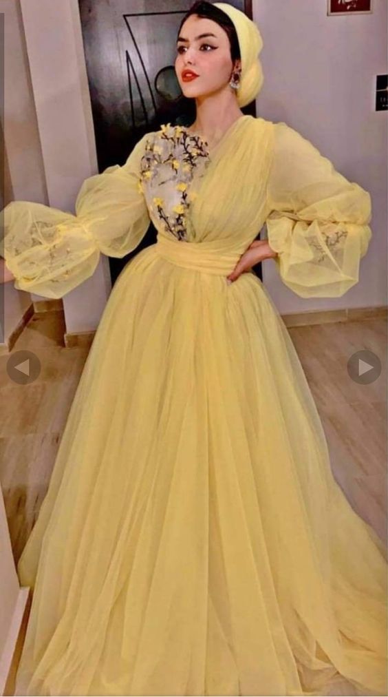 فستان أصفر سواريه للمحجبات من التول المنفوش