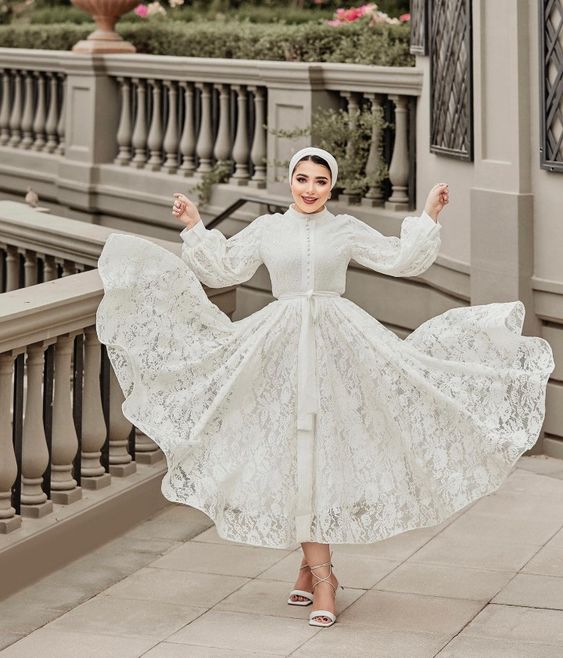 فستان سواريه محجبات رقيق وبسيط من الدانتيل الأبيض