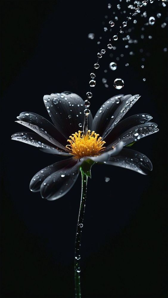 جمال الزهرة التي تتلألأ عليها قطرات الماء وسط الظلام